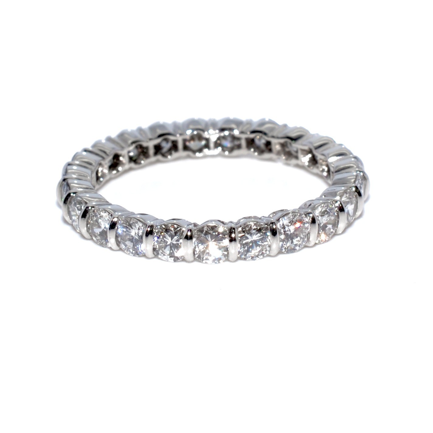 Fabriquées en platine ou en or 18 carats, ces bagues offrent à la fois solidité et élégance. Les diamants taillés en brillant, disposés en ligne continue, sont choisis pour leur capacité à capter la lumière sous tous les angles, créant ainsi un éclat maximal. Le sertissage varie selon le style : grain, barrette ou chaton fermé, chacun influençant la brillance et la finesse du bijou.