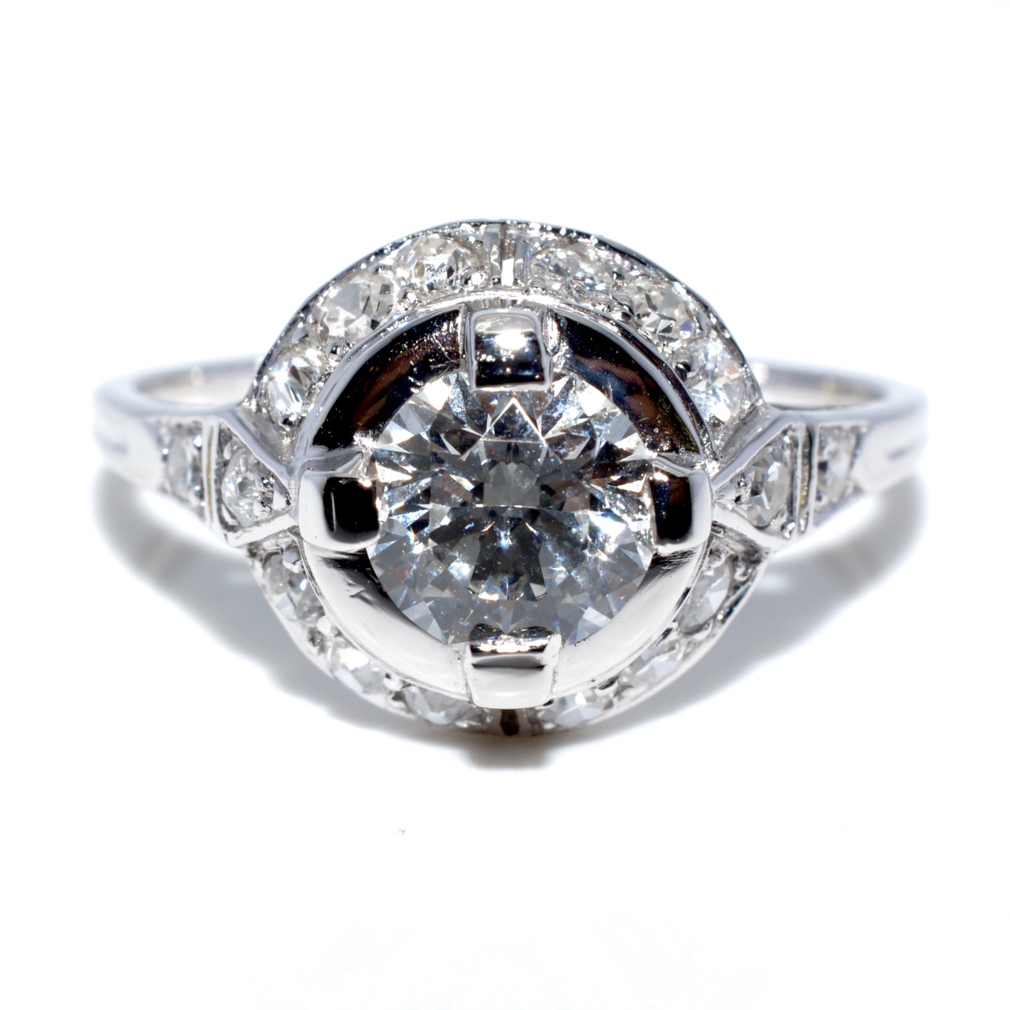 Les bagues Art Déco rondes en platine et diamants, créées en France dans les années 1920, sont représentatives du raffinement et de la précision joaillière de cette époque. Leur structure circulaire met en avant un pavage de diamants taille ancienne ou brillant, disposés en motifs géométriques, en rosette ou en halo autour d'une pierre centrale.