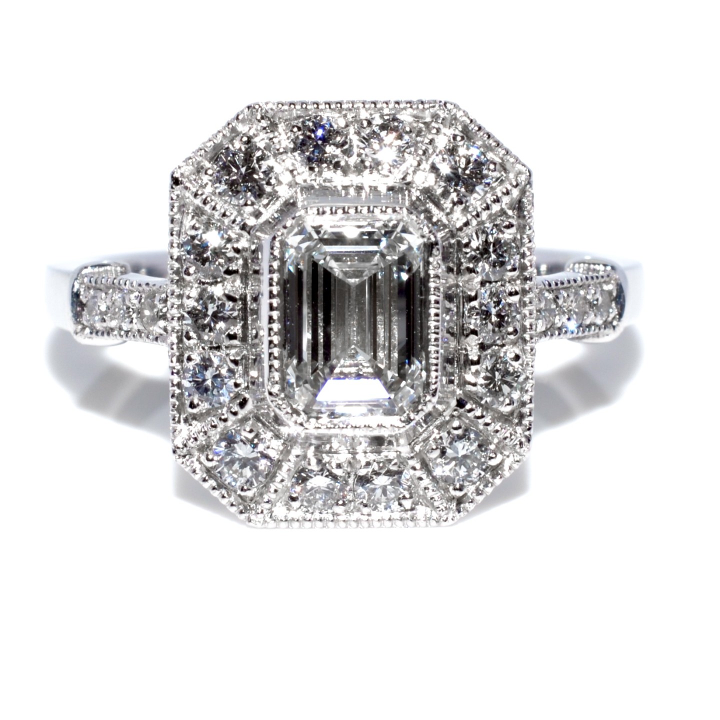 Cette bague en platine séduit par son design raffiné et son éclat naturel. Son centre est orné d’un diamant taille émeraude de 1,01 carat (G/VS1, certifié GIA), dont la taille met en valeur sa transparence et sa luminosité. Autour, des diamants taillés en brillant (0,41 carat) accentuent son éclat sans en faire trop.