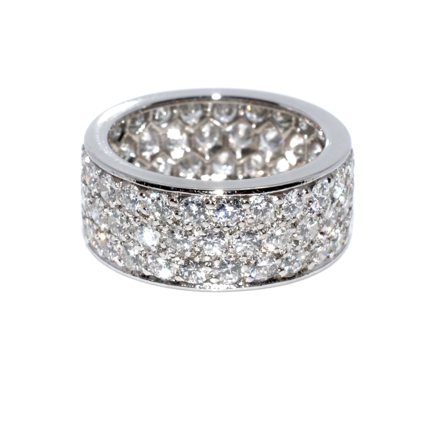 Fabriquées en platine ou en or 18 carats, ces bagues offrent à la fois solidité et élégance. Les diamants taillés en brillant, disposés en ligne continue, sont choisis pour leur capacité à capter la lumière sous tous les angles, créant ainsi un éclat maximal. Le sertissage varie selon le style : grain, barrette ou chaton fermé, chacun influençant la brillance et la finesse du bijou.