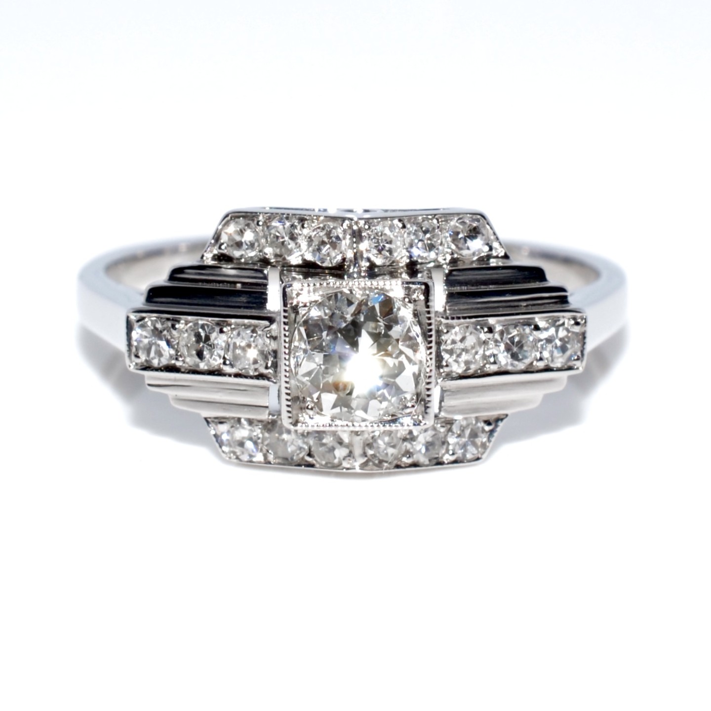 Le design de cette bague aux lignes géométriques est typique de la période Art-Déco, vers 1920-1930.