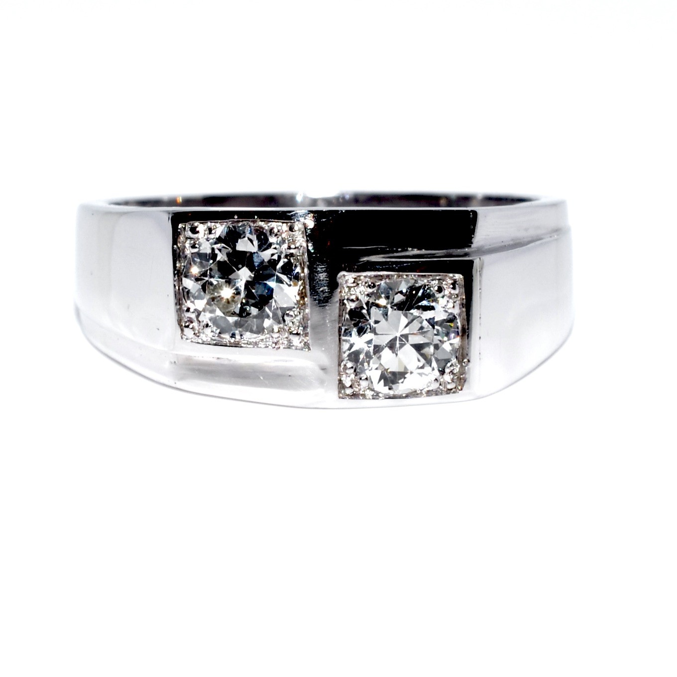 Cette sublime bague Art-Déco géométrique en platine est sertie de deux diamants taillés à l'ancienne pesant environ 0,80 carat. Monture fabriquée vers 1920, typique des bijoux Art-Déco.