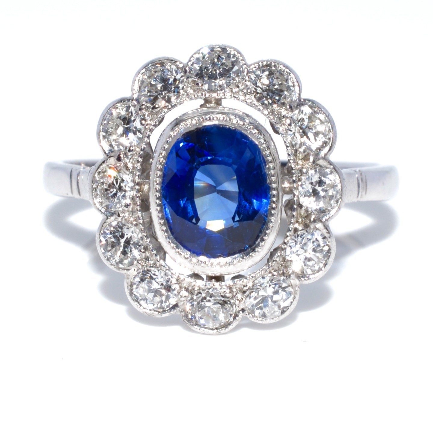 Réalisée en platine, métal prisé pour sa solidité et sa neutralité, elle présente une monture rigide, aux lignes droites ou à pans coupés. Le saphir, taillé en coussin, ovale ou émeraude, occupe le centre de la composition, souvent encadré de diamants taille ancienne, baguette ou brillant. L’agencement régulier des pierres et le soin apporté aux proportions traduisent le haut niveau de précision propre aux ateliers parisiens de l’époque.