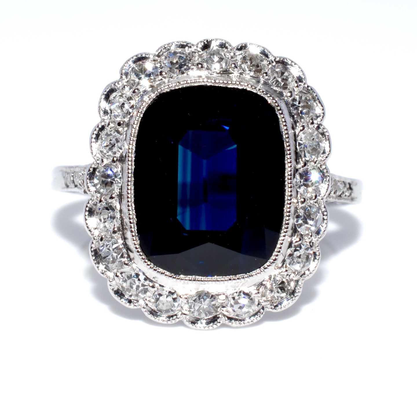 Au centre, le saphir australien se distingue par sa couleur bleue profonde, presque nocturne, qui contraste harmonieusement avec l’éclat des diamants taillés à l’ancienne l’entourant. Ces diamants, disposés en entourage ou en lignes graphiques, renforcent la structure visuelle et la lumière du bijou.