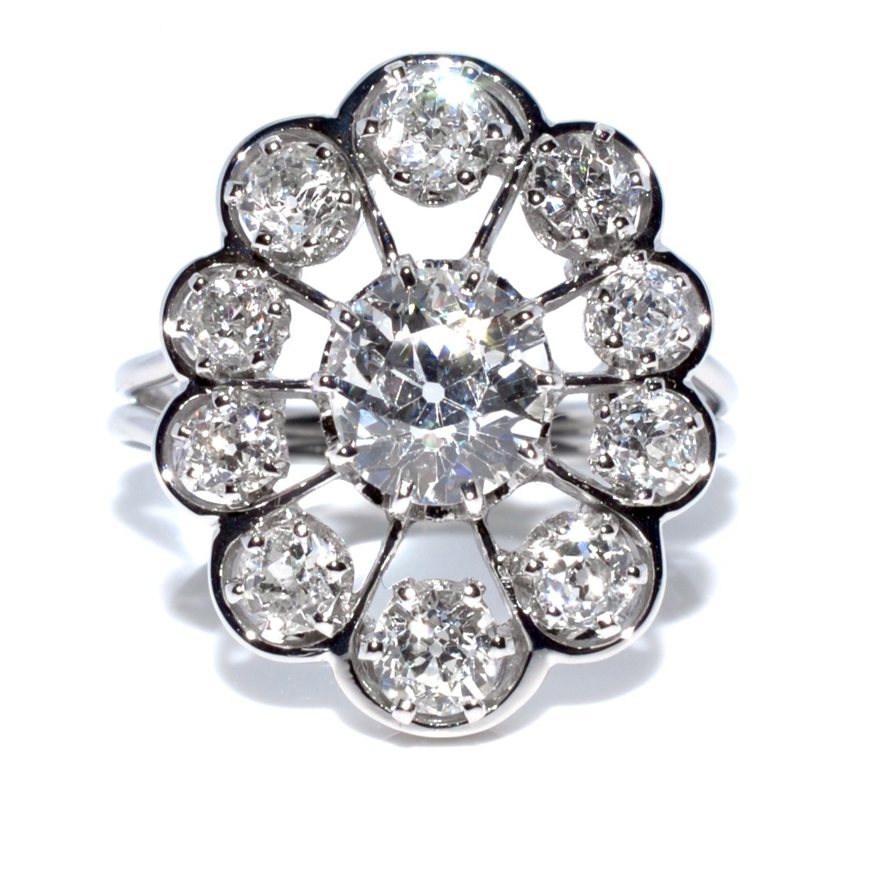 Les bagues Art Déco rondes en platine et diamants, créées en France dans les années 1920, sont représentatives du raffinement et de la précision joaillière de cette époque. Leur structure circulaire met en avant un pavage de diamants taille ancienne ou brillant, disposés en motifs géométriques, en rosette ou en halo autour d'une pierre centrale.