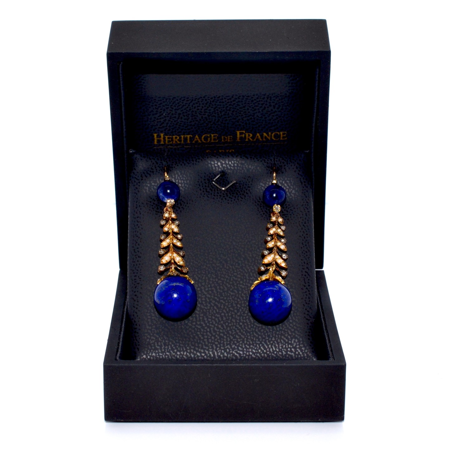 Les ateliers parisiens de l’époque l’intègrent volontiers dans des montures en or 18 carats ou en argent doré, souvent rehaussées de motifs néoclassiques ou orientalisants. La technique du serti clos, très utilisée, protège la pierre tout en soulignant la pureté de sa surface opaque. Le lapis est alors associé à des perles, au corail ou à de fines arabesques émaillées, créant un contraste raffiné recherché dans les bijoux dits « sentimentaux » ou dans les parures complètes.