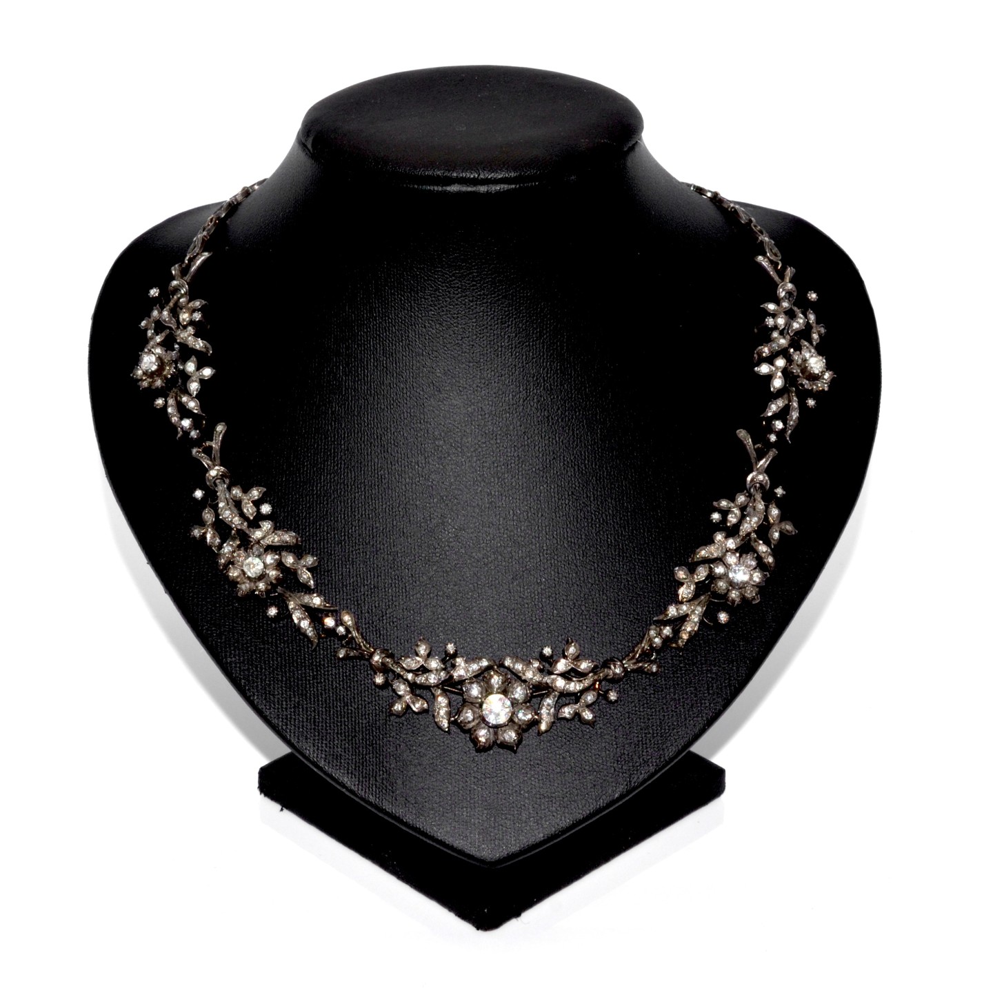 Il se positionne merveilleusement bien. Il est très agréable à porter car ses maillons sont bien plats côté peau. Les diamants taillés en rose sont d'une belle brillance et contraste bien avec l'argent noirci, un effet classique des bijoux anciens de la période 1850-1870.