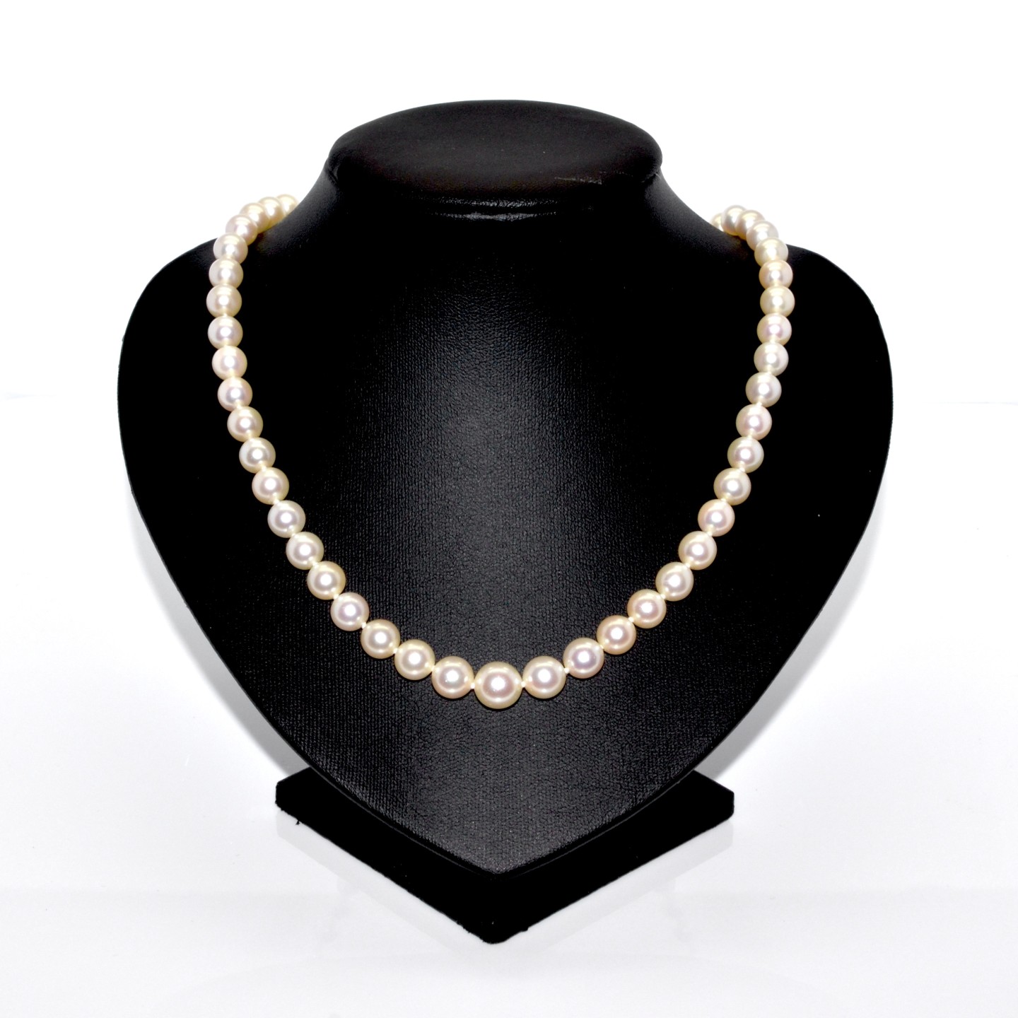 Masquer les prixCe beau collier vintage de 48cm est composé d'une rangée de 61 perles de culture en chute (6,7 à en 9,4mm environ) . Elles sont d'une belle couleur crème. Le fermoir en or jaune 18 carats est en parfait état. Il est serti de diamants taillés en brillant pour un poids total d'environ 0,60 carat.