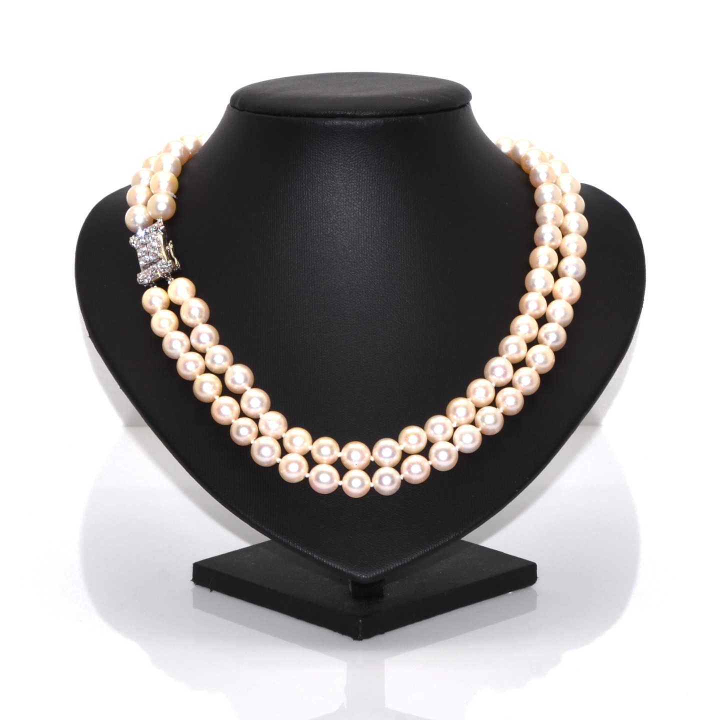 Ce beau collier vintage de 42cm est composé d'une double rangée de 95 perles de cultures calibrées (env. 8mm) . Elles sont d'une belle couleur crème. Le fermoir en or gris 18 carats est en parfait état. Il est serti de diamants taillés en brillant pour un poids total d'environ 1,20 carat.