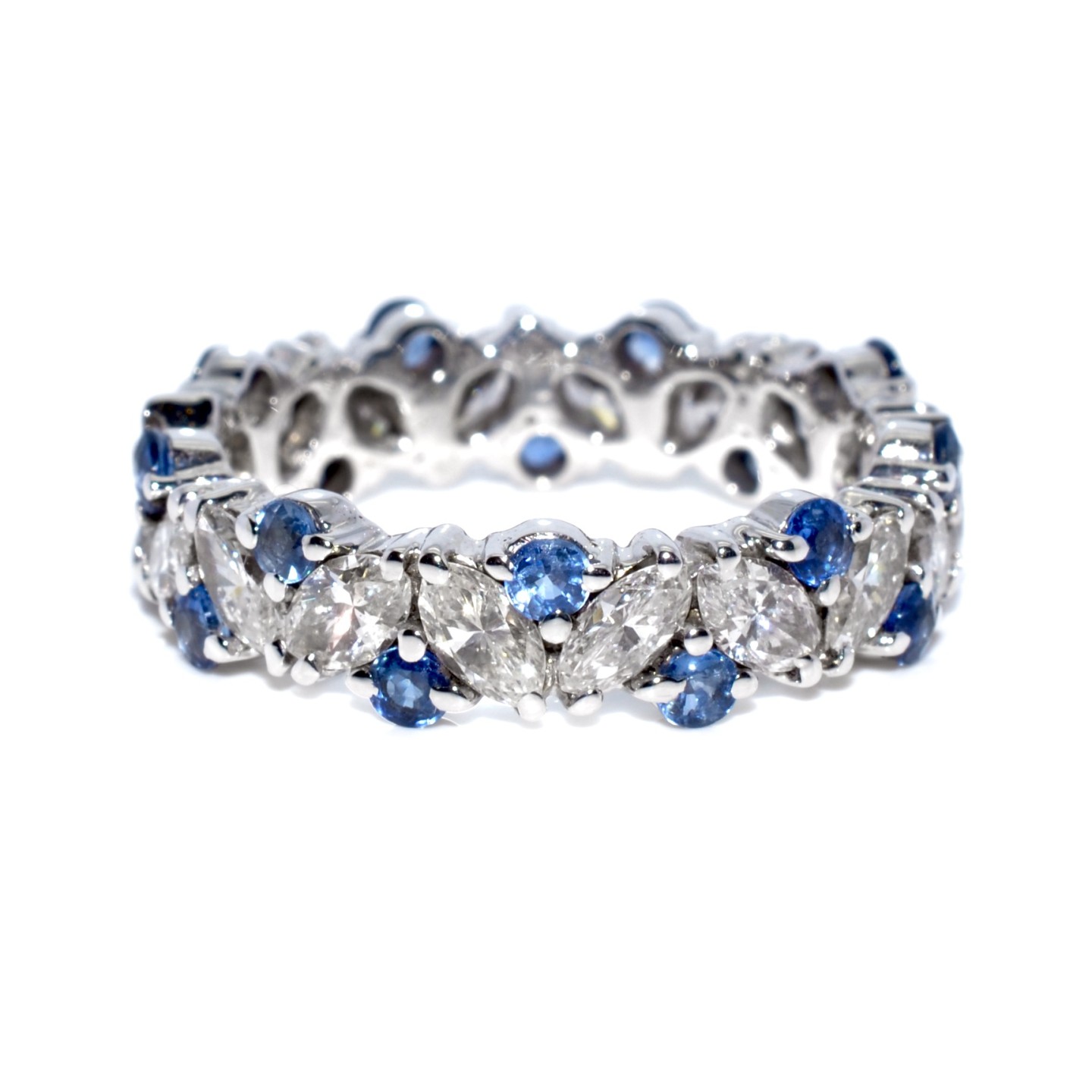 Fabriquées en platine ou en or 18 carats, ces bagues offrent à la fois solidité et élégance. Les diamants taillés en brillant, disposés en ligne continue, sont choisis pour leur capacité à capter la lumière sous tous les angles, créant ainsi un éclat maximal. Le sertissage varie selon le style : grain, barrette ou chaton fermé, chacun influençant la brillance et la finesse du bijou.